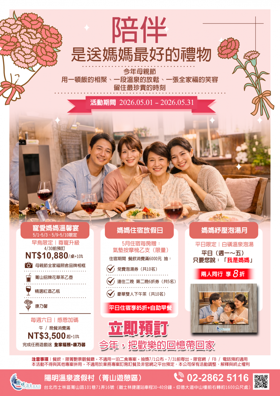 陽明溫泉渡假村隸屬內政部營建署陽明山國家公園管理處管轄,於2017年12月23日以嶄新面貌重新開幕,並於2021年由原來名稱-菁山遊憩區,正式更名”陽明溫泉渡假村”成為北市極為難得的渡假聖地。
