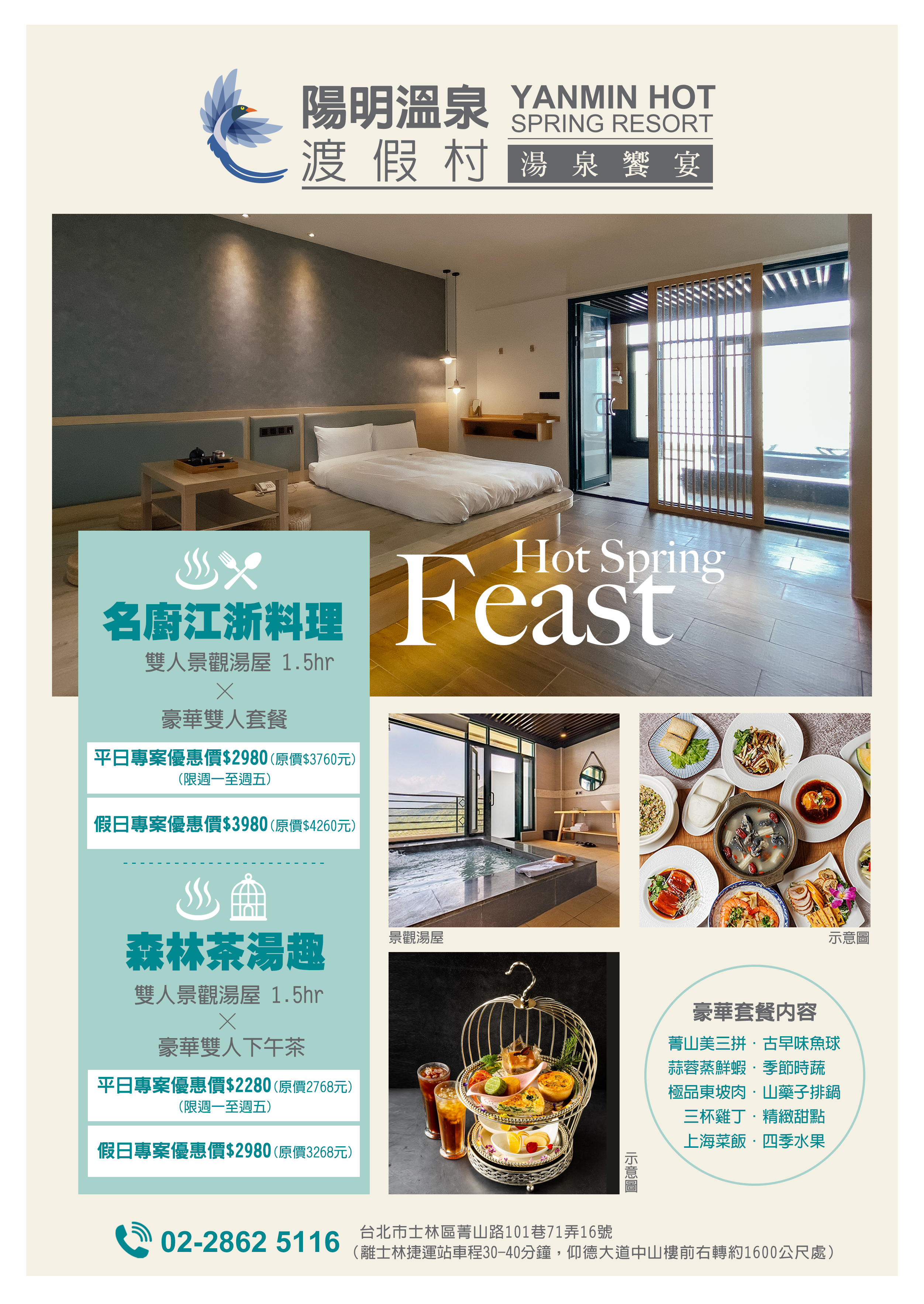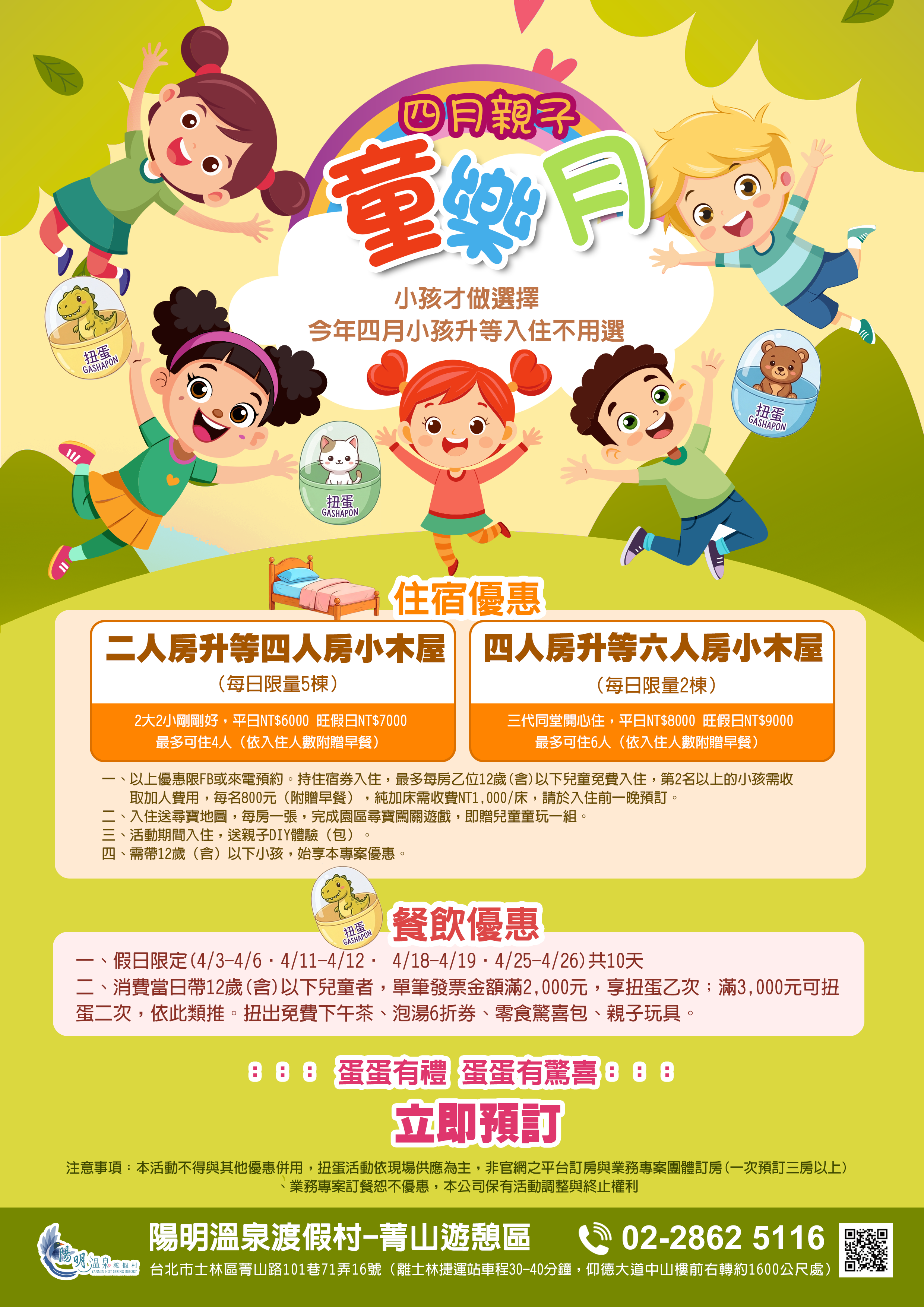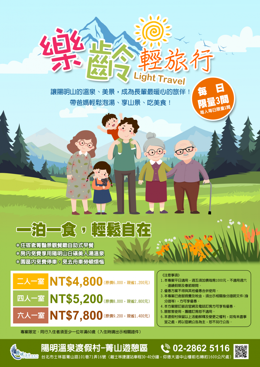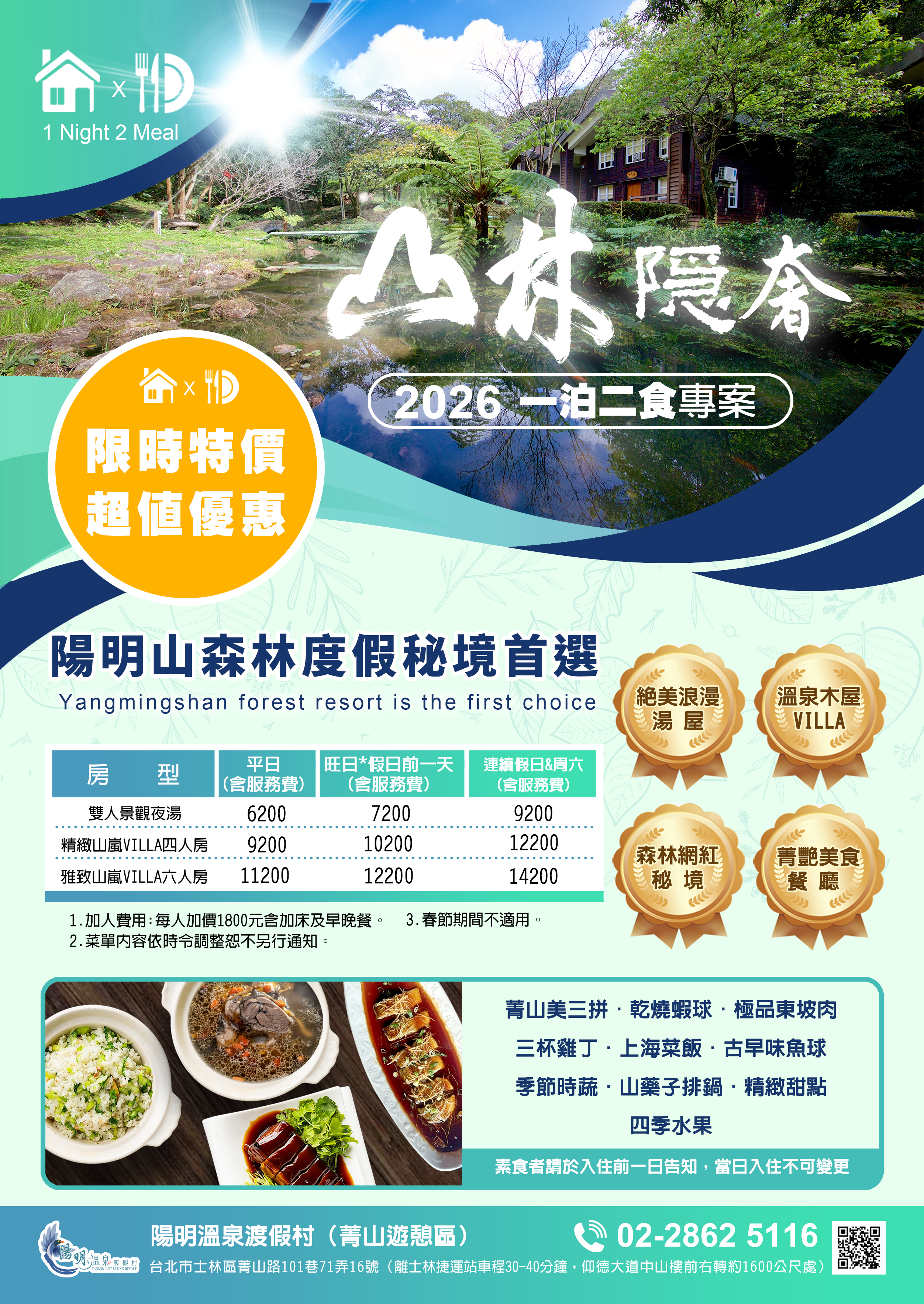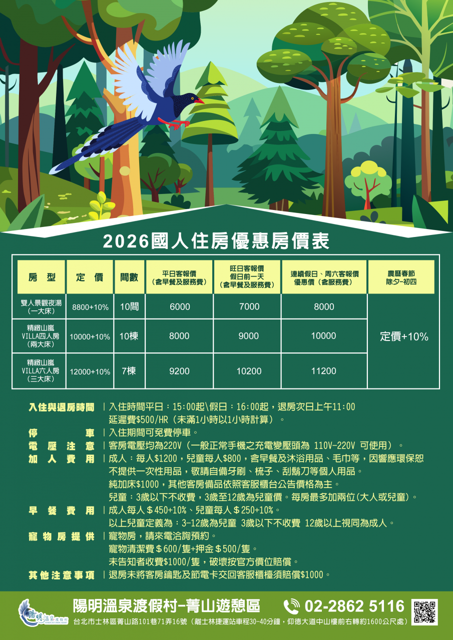 陽明溫泉渡假村6公頃的園區提供了獨棟VILLA木屋住宿、景觀湯屋、景觀餐廳、景觀咖啡廳、豪華露營、環境教育服務、會議假期、客製化活動規劃、團體專案、親子diy及攀樹活動等,非常適合三五好友及親子全家出遊。全新的體驗,並且深入了解陽明山自然景觀之美、生態之豐富性。