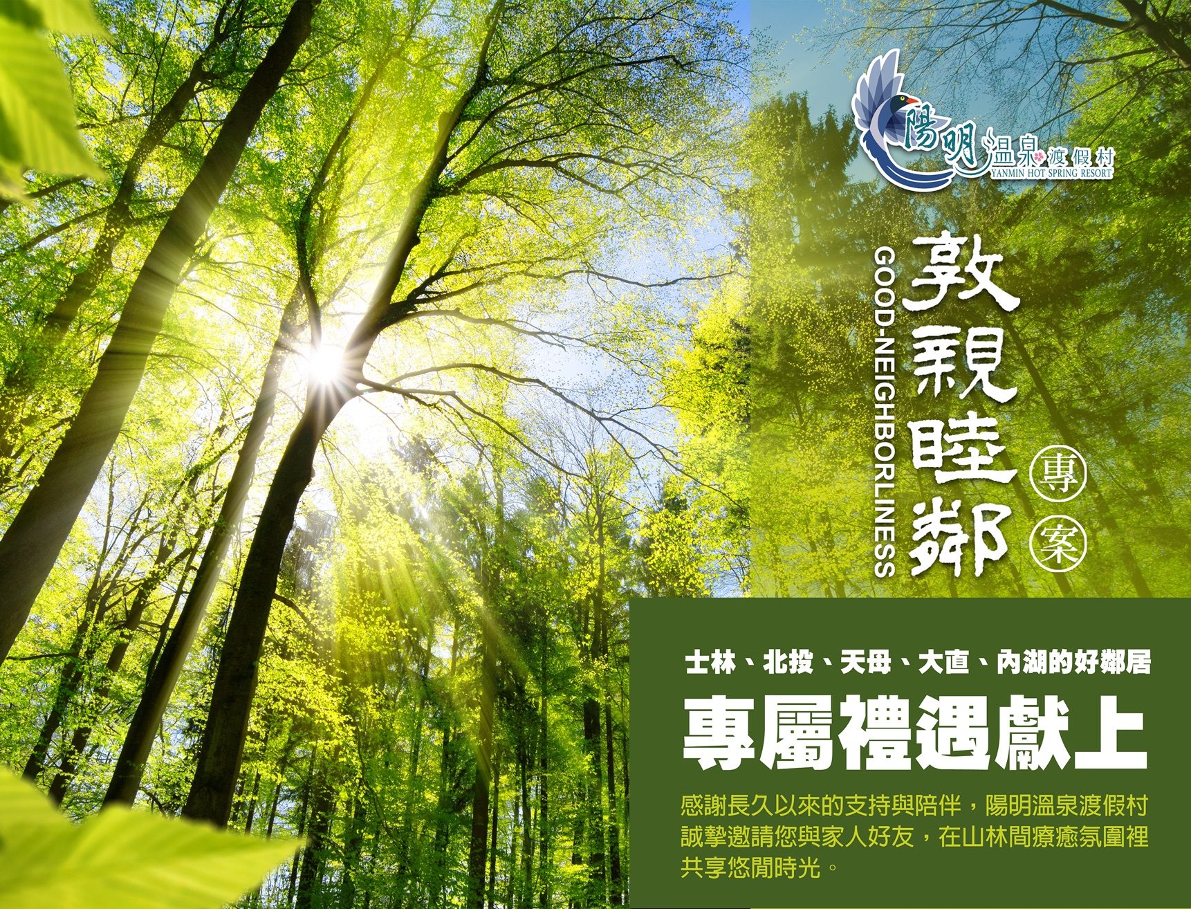 陽明溫泉渡假村 敦親睦鄰專案 🌿 士林、北投、天母、大直、內湖的好鄰居,專屬禮遇獻上! 感謝長久以來的支持與陪伴,陽明溫...